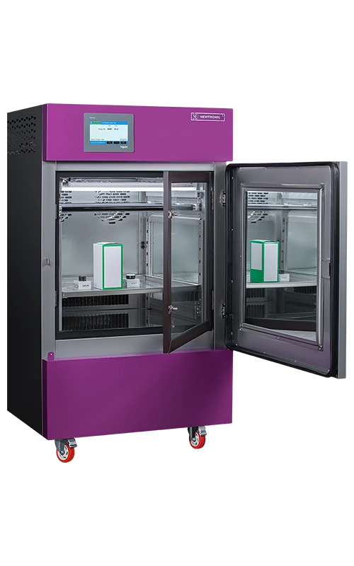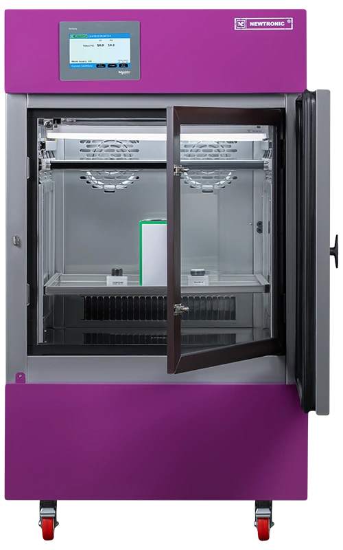 Newtronic chambers are fully controlled via the PLC with features such as alarms for aging lamps, auto-switch off of UV lights upon door opening. Specular reflective surfaces provide uniform UVA & VIS light reflection and maintain proper SPD (spectral power distribution). Additionally, the chamber also provides precise humidity control.